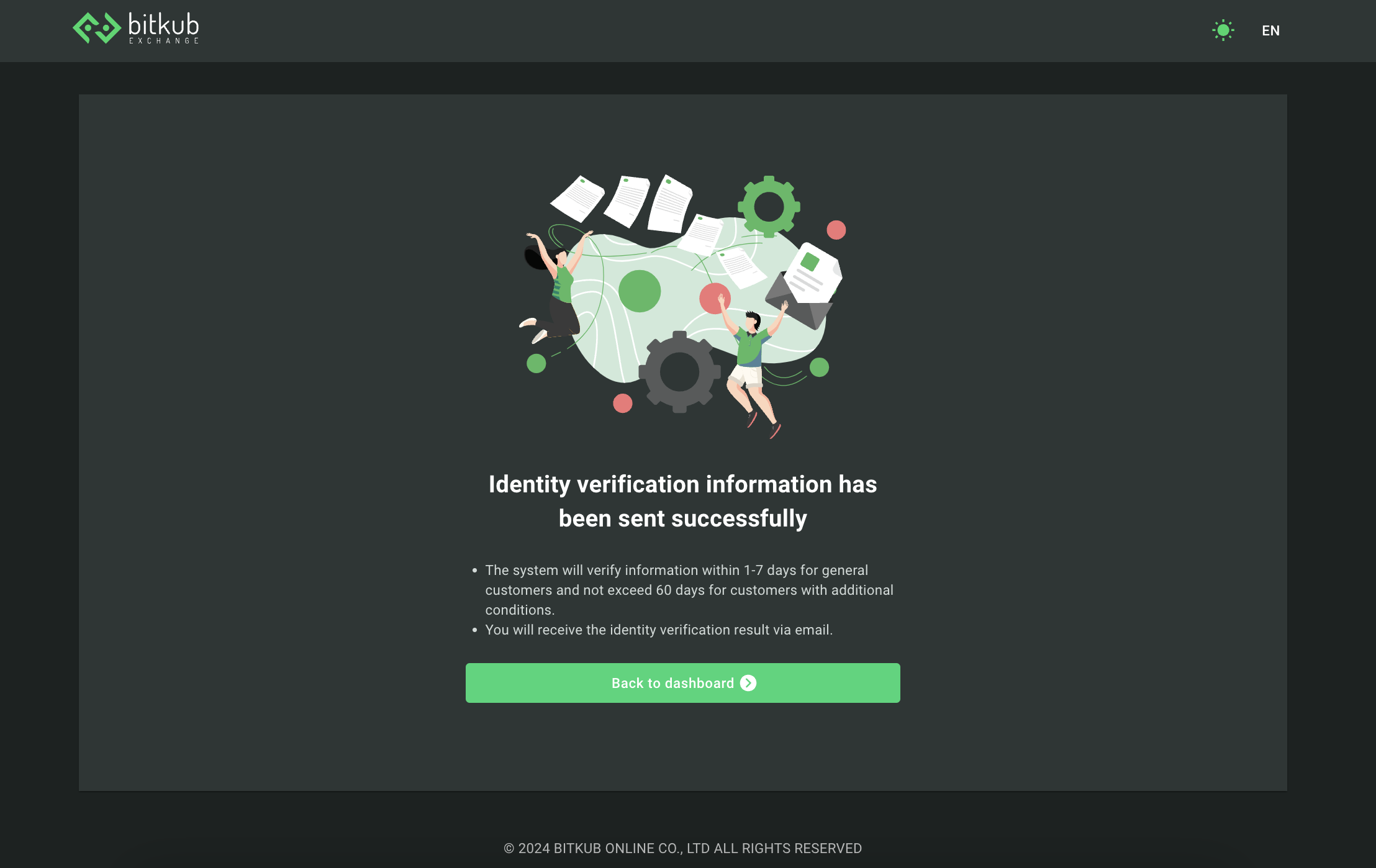 After we receive the correct and complete information/documents from you, we will send the verification result to your email address registered with Bitkub Exchange as soon as possible, or within 1-7 days for general customers and within 60 days for customers with additional conditions.