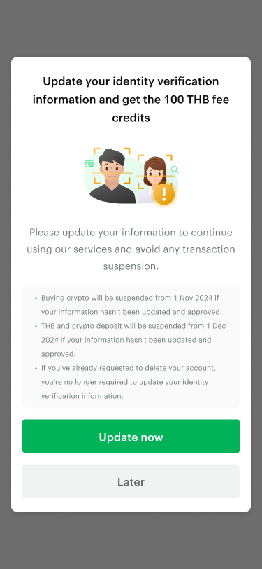 Bitkub Online Co., Ltd. (“the Company”) has a policy to conduct periodic verification, so-called ‘KYC Update’, of all accounts on our system to review the verification information (KYC) and account’s daily limit to make sure that all the information on the system is as current and accurate as possible at all times in order to comply with the law and the services of the Company. When an account is due for this verification, the account owner will receive an email notification 30 days before the due date for the KYC Update to inform and remind them to recheck and update their account information to be up-to-date. We recommend that you update your account information as soon as possible after receiving the notification for an account information update.