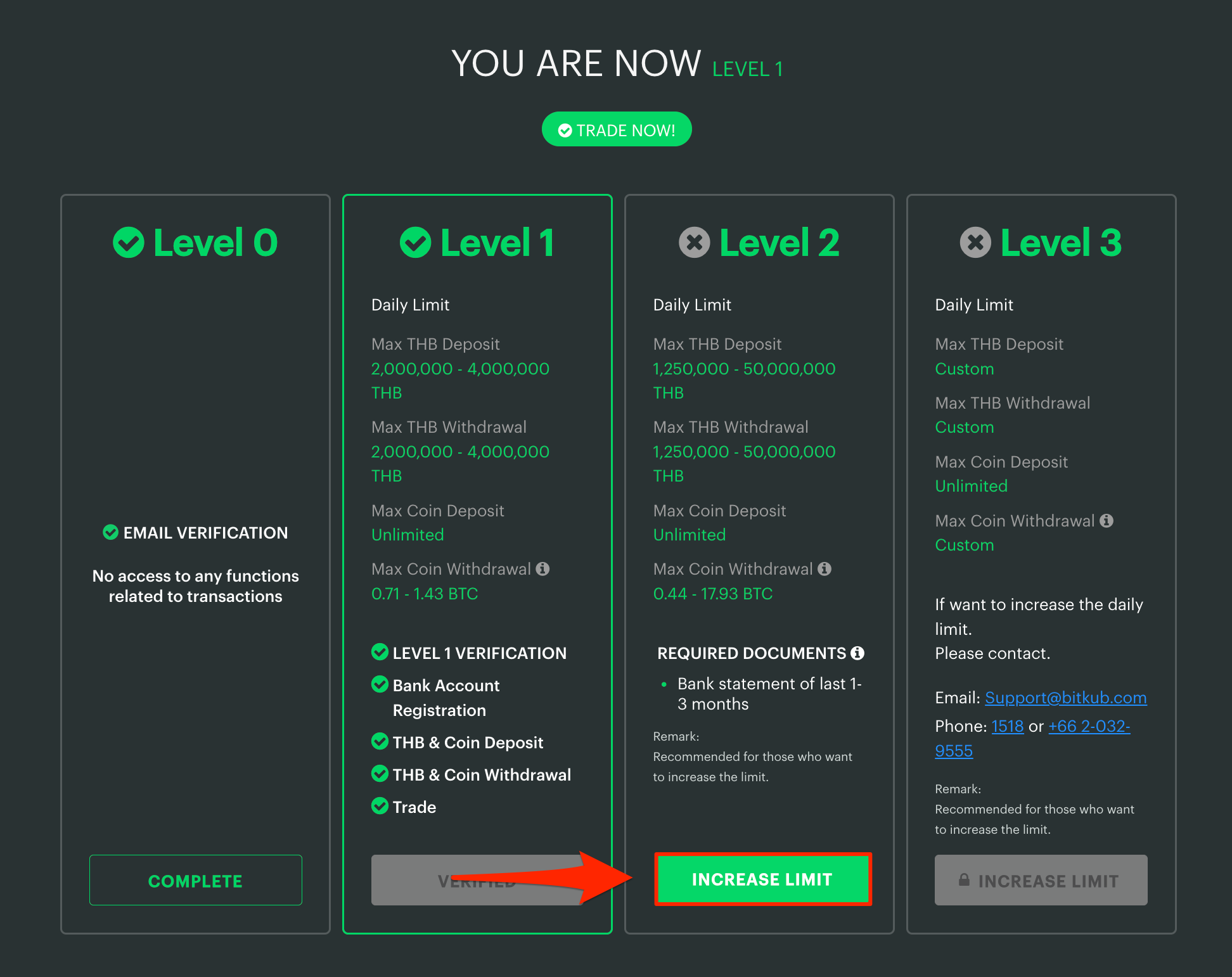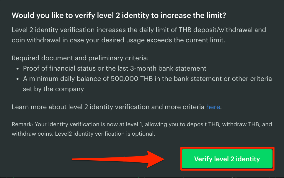 KYC level 2 can be done to increase the daily limit of THB deposits and withdrawals, and crypto withdrawals, in case your current limit is insufficient.